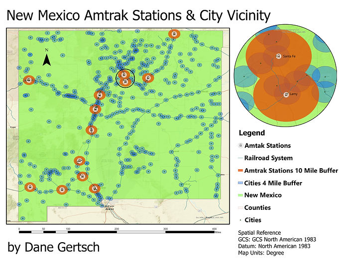 In this project we took infrastructure data from New Mexico. The goals were to create 10 mile buffers on Amtrak Stations, and find cities in the nearby vicinity. I made a script to calculate the nearest cities next to a Amtrak Stations. I manipulated list data, and altered the attribute table. Lastly, I looped over a list of shapefiles and create buffers of varying distance; (2,4,8, and 10 miles). In the legend is two of the loops at 4, and 10 miles.